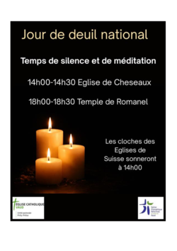 L’Église réformée vaudoise souhaite partager sa solidarité, son Espérance et son soutien lors d’une prière commune prononcée à l’occasion des cultes dominicaux dans le Canton. Cette prière sera également lue lors des services religieux organisés par le Fédération des paroisses catholiques et celui de la Communauté juive de Lausanne et du Canton de Vaud.